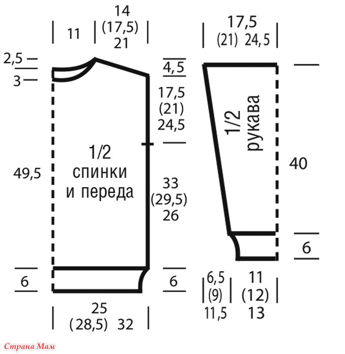 Через 55 см = 148 рядов от планки закрыть оставшиеся по 4 (5) 6 п. плеч.