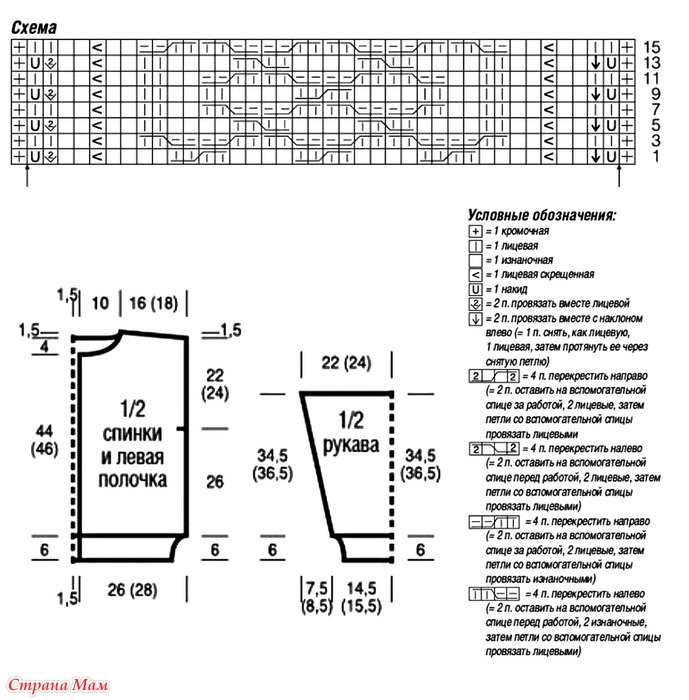 Продолжить работу на спицах № 3,5 узором 2, при этом для 2-го размера после кромочной начать с последних 7 п. раппорта, выполнить 4 х 38 п. раппорта между стрелками и закончить первыми 7 п. раппорта и 1 кромочной.