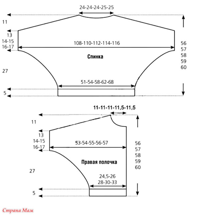 Спинка: спицы № 4 набрать 101 (105) 113 (121) 131 п. и вязать для нижней планки 5 см резинкой, начиная и заканчивая 1 лиц. Перейти на спицы № 5,5 и продолжить работу лицевой гладью, равномерно убавив в 1-м р. 17(17)19(19)21 п. = 84 (88)94 (102) 110 п. Одновременно, начиная от нижней планки прибавить с обеих сторон для боковых скосов в каждом 4-м р. 4 х 1 п. (4 х 1 п.) 5 х 1 п. (6 х 1 п.) 7 x 1 п., затем в каждом 2-м р. 8 х 1 п., 8 х 2 п., 4 х 3 п. и 1 х 5 п. (8 х 1 п., 8 х 2 п., 4 х 3 п. и 1 х 5 п.) 6 х 1 п., 8 х 2 п., 4 х 3 п. и 1 х 5 п. (6 х 1 п„ 6 х 2 п., 4 х 3 п. и 1 х 5 п.) 5 х 1 п., 5 х 2 п„ 4 х 3 п. и 1 х 5 п. = 174 (178) 182(184) 188 п. Через 32 см от наборного ряда отметить маркерами с обеих сторон начало планок рукавов. Через 45 (46) 47 (48) 49 см от наборного ряда закрыть с обеих сторон для плечевых скосов в каждом 2-м р. 10 х 5 п. и 3 х 6 п. (8 х 5 п. и 5 х 6 п.) 6 х 5 п. и 7 х 6 п. (6 х 5 п. и 7 х 6 п.) 4 х 5 п. и 9 х 6 п. Одновременно через 54 (55) 56 (57) 58 см от наборного ряда закрыть для горловины средние 18 (18) 18 (20) 20 п. и обе стороны вязать раздельно. Для закругления горловины закрыть с внутреннего края через следующие 2 р. 1 х 10 п.