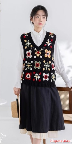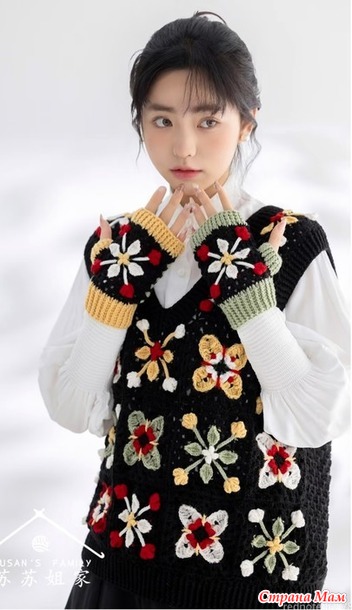 Безрукавка перед которой выполнен из красочных бабушкиных квадратов+ митенки. Крючок.