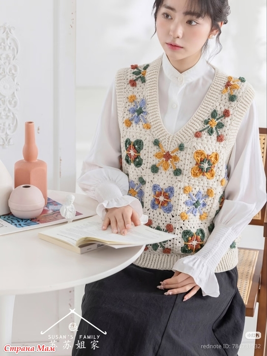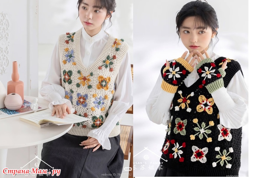 Эта безрукавка доступна в больших и маленьких размерах. Способ вязания тот же, отличается только размер крючка. Жилет состоит из переда, спинки, соединительного ряда и обвязки. Сначала свяжите переднюю и заднюю части крючком и соедините их. После этого свяжите воротник, манжеты и подол в нужных местах.