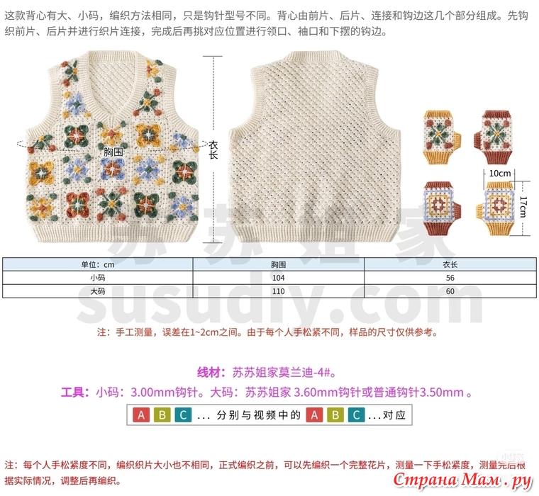 Инструменты: Маленький размер: крючок 3,00 мм. Большой размер: крючок SuSu sister’s 3,60 мм или обычный крючок 3,50 мм.