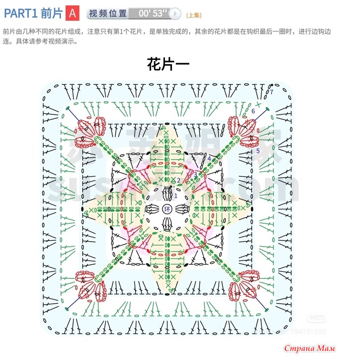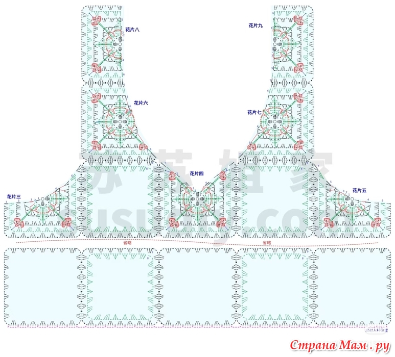 Передняя часть состоит из нескольких разных цветочных деталей. Обратите внимание, что отдельно выполняется только первая деталь. Остальные детали соединяются во время вязания последнего круга. Подробности смотрите в видео.