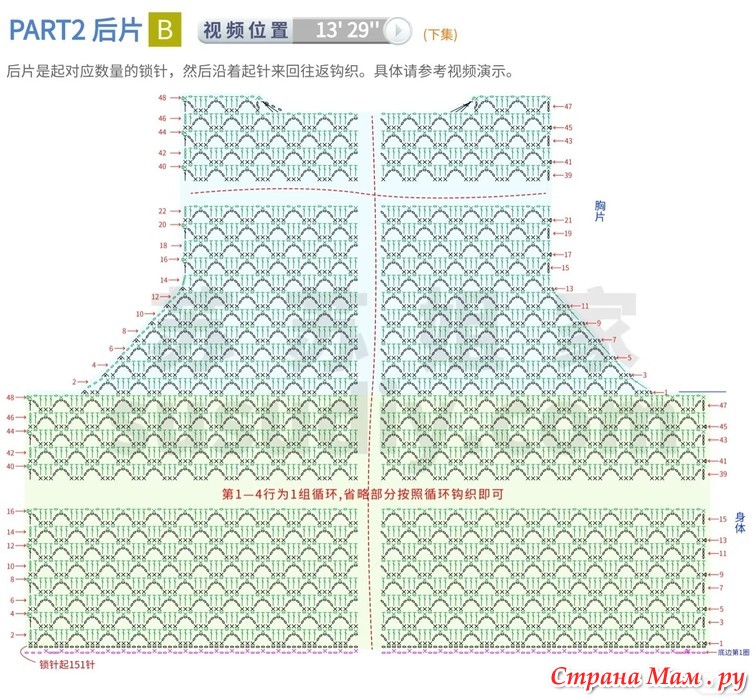 Ряды с 1 по 4 представляют собой набор петель. Пропущенные части можно просто довязать крючком по петле.