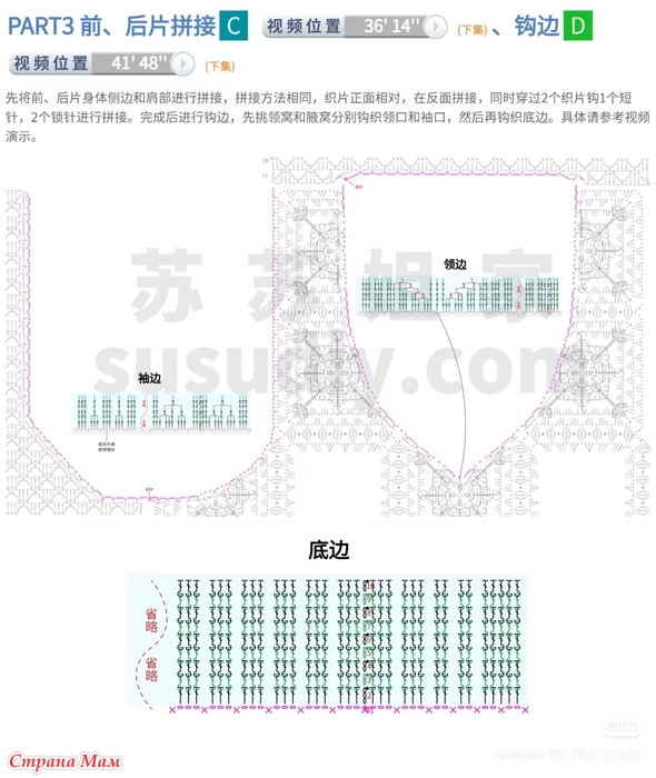 Сначала соедините переднюю и заднюю части по бокам и плечам. Используйте тот же метод, расположив передние части друг напротив друга, и соедините детали с изнаночной стороны. Одновременно проденьте одну короткую петлю через обе части и соедините их двумя воздушными столбиками. После этого обвяжите края, начиная с воротника и подмышек, затем манжеты и подгибку. Затем обвяжите нижний край. Подробности смотрите в видео.