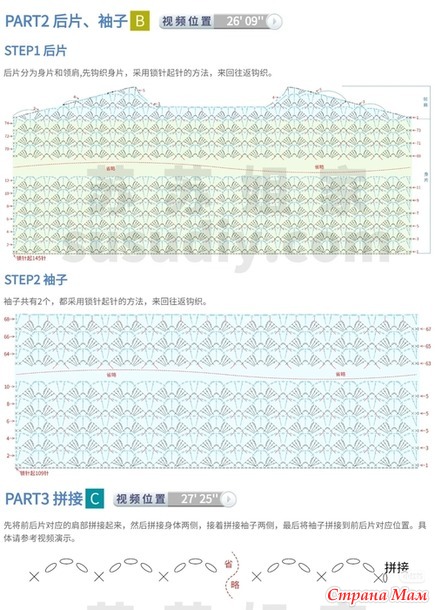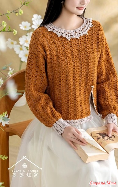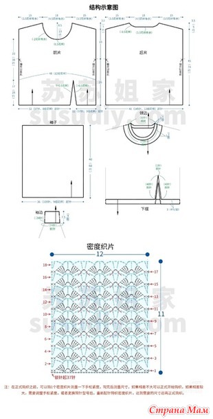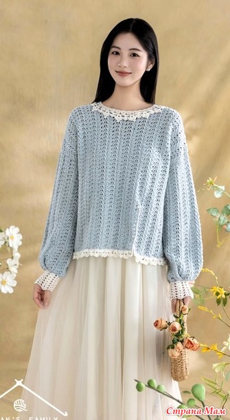 Этот топ состоит из переда, спинки, рукавов, шва, низа рукавов, воротника, подола и отделки. Сначала вяжите перед, спинку и рукава отдельно. После этого соедините соответствующие части. Затем вяжите нижние части рукавов, воротник и подола в соответствующих областях. Наконец, пришейте отделку.