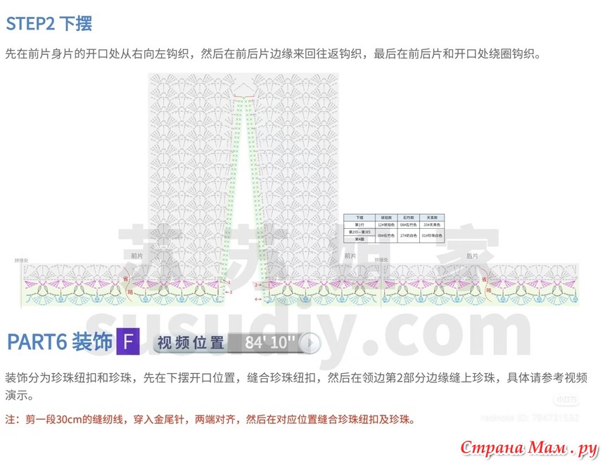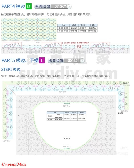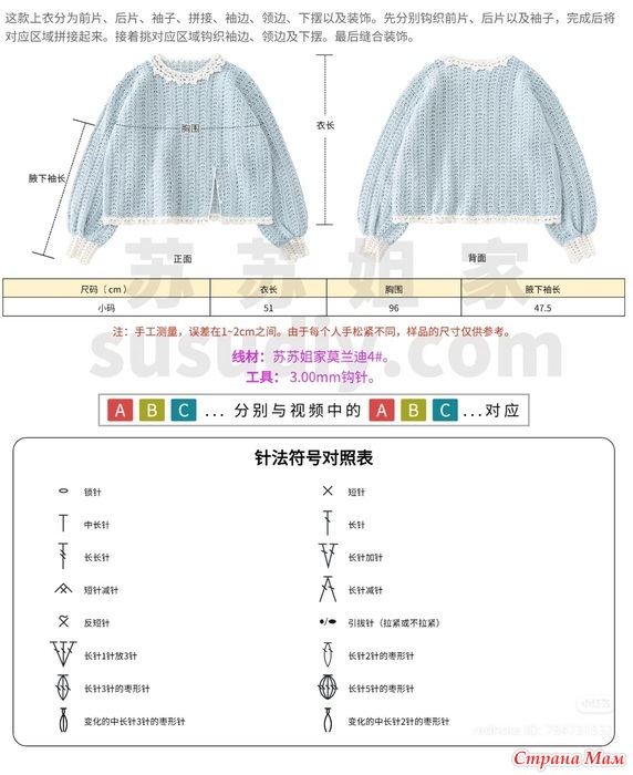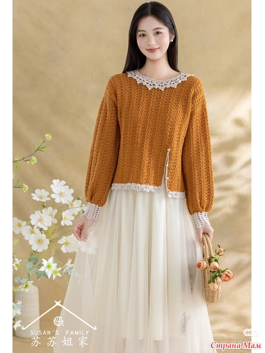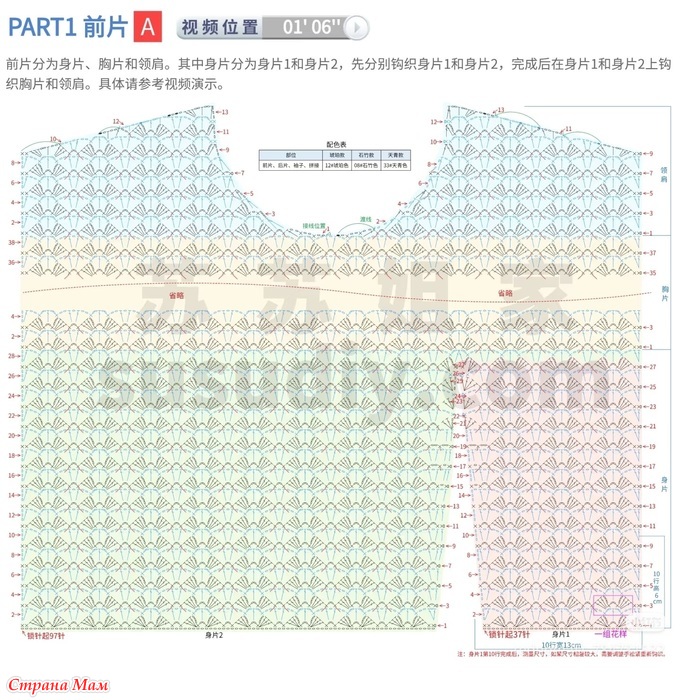 Этот топ состоит из переда, спинки, рукавов, шва, низа рукавов, воротника, подола и отделки. Сначала вяжите перед, спинку и рукава отдельно. После этого соедините соответствующие части. Затем вяжите нижние части рукавов, воротник и подола в соответствующих областях. Наконец, пришейте отделку.