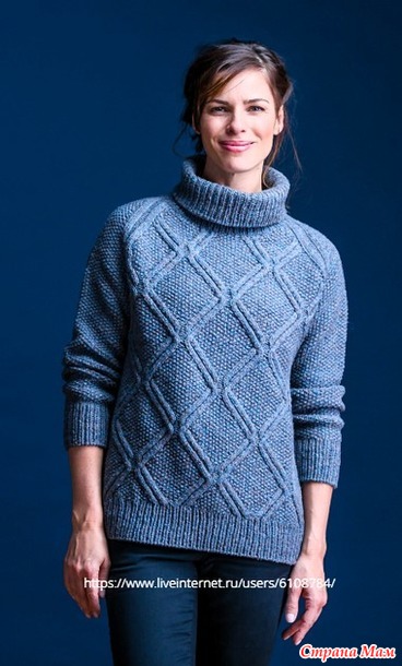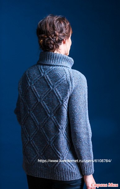 Корпус и рукава вяжем по кругу снизу вверх и затем соединяем, чтобы вязать кокетку по кругу. Во время формирования горловины кокетку вязать рядами с поворотом работы.
