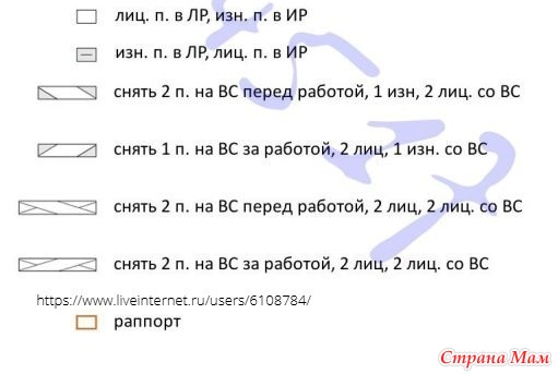 Во время вязания по кругу, читать все круговые ряды схемы справа налево. Во вре мя вязания плоским полотном, читать лицевые (нечетные) ряды справа налево, а изнаночные (четные) ряды слева направо.