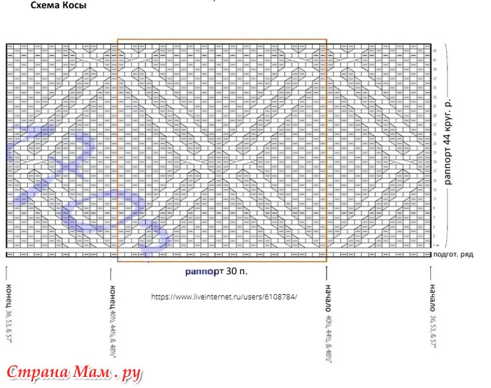 Один раппорт из 30 п. по схеме с косами составляет 5.75" в ширину спицами А и в 2 нити, взятые вместе, после блокировки.