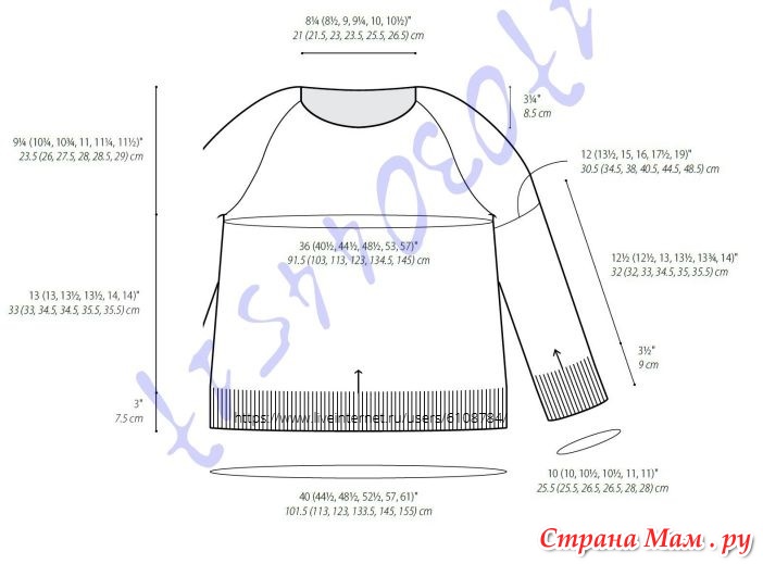 Размеры свитера: 36 (40.5, 44.5, 48.5, 53, 57)" [91.5 (103, 113, 123, 134.5, 145) см) по окружности груди.