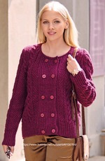 Вам потребуется: пряжа (70% овечьей шерсти, 30% шерсти яка; 120 м/50 г) – 550 (600) 650 г ягодной; спицы № 3,5 и 4,5; круговые спицы № 3,5; 10 пуговиц диаметром 22 мм.