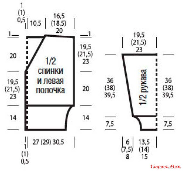 Для скосов прибавить с обеих сторон в 15 (13) 13-м р. от планки 1 х 1 п., затем в каждом 14-м р. 5 х 1 п. и в каждом 12-м р. 8 х 1 п. (в каждом 12-м р. 11 х 1 п. и в каждом 10-м р. 5 х 1 п.) в каждом 12-м р. 10 x 1 п. и в каждом 10-м р. 7 х 1 п. согласно узору = 89 (99) 105 п.