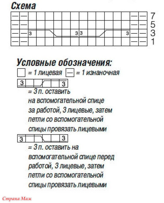 Узор 3: «коса» (на 16 п.) = вязать согласно схеме. На ней даны только лицевые ряды. В изнаночных рядах петли провязывать по рисунку.