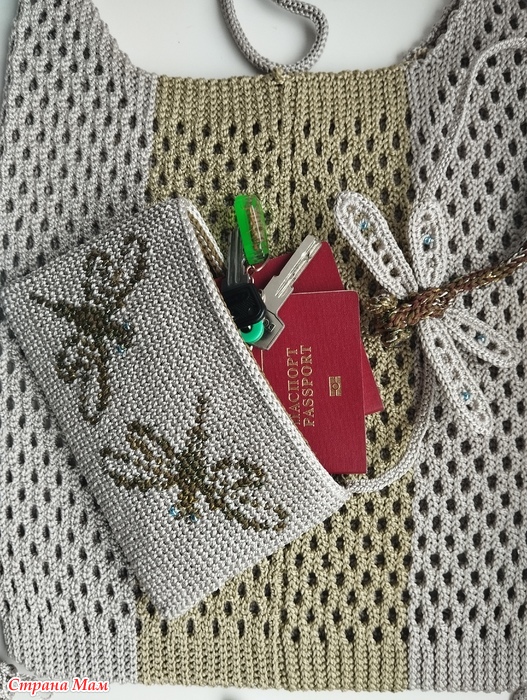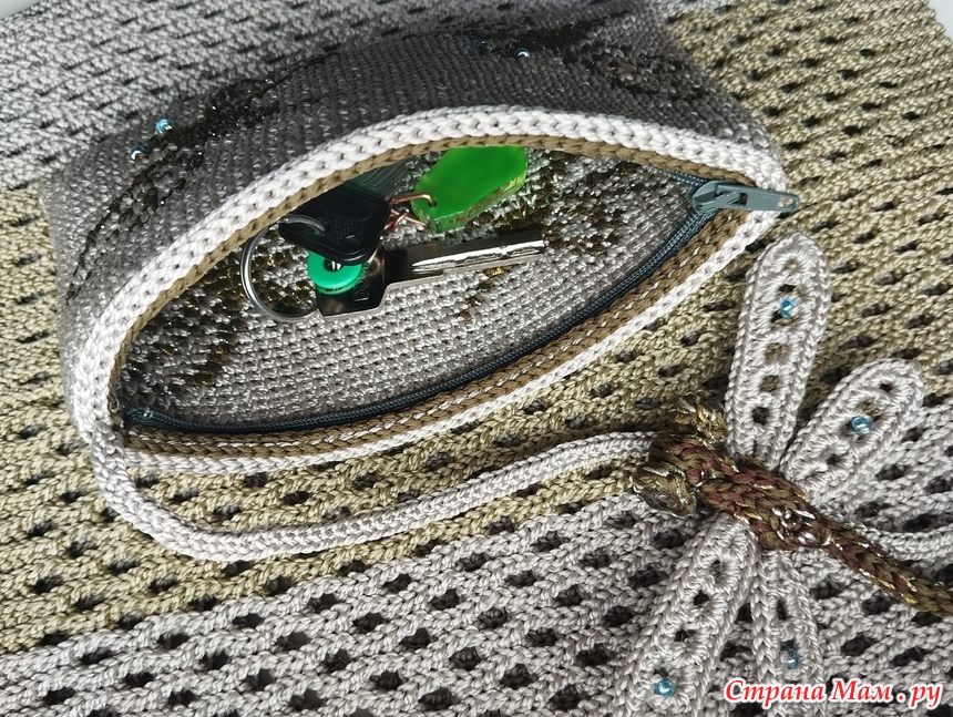 Внутренний кармашек связан в технике жаккрада галочками в раскол и скорее похож на косметичку, но главное, что со своей ролью хранения самого ценного справится