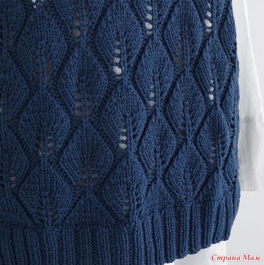 Ажурная безрукавка с большими проймами и лиственным узором. Спицы.