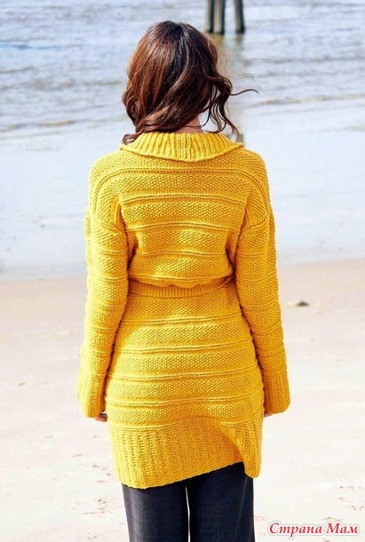 Длинный ярко-жёлтый кардиган оверсайз на поясе с лацканами и структурным узором