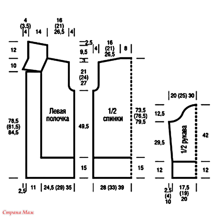 Для скосов прибавить с обеих сторон в следующем 19 (9) 7-м р. 1 х 1 п. и в каждом 18-м р. 3 х 1 п. (в каждом 8-м р. 7 х 1 п. и в каждом 6-м р. 3 х 1 п.) в каждом 6-м р. 7 х 1 п. и в каждом 4-м р. 9 х 1 п. согласно узору. = 68 (86) 102 п.