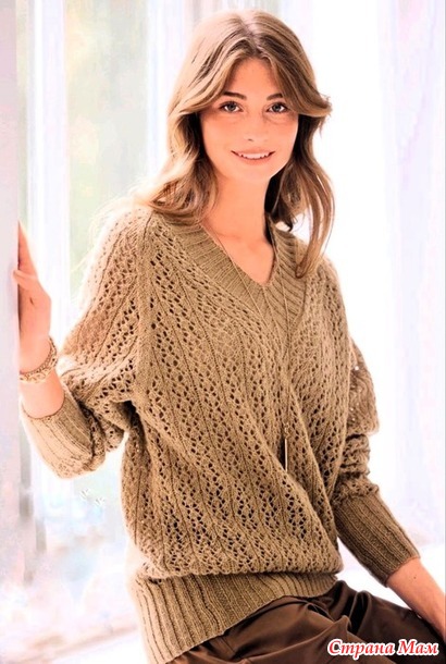 Особые детали: раппорт ажурного узора за счет убавок повторяет форму горловины, а линии реглана подчеркнуты лицевой гладью.