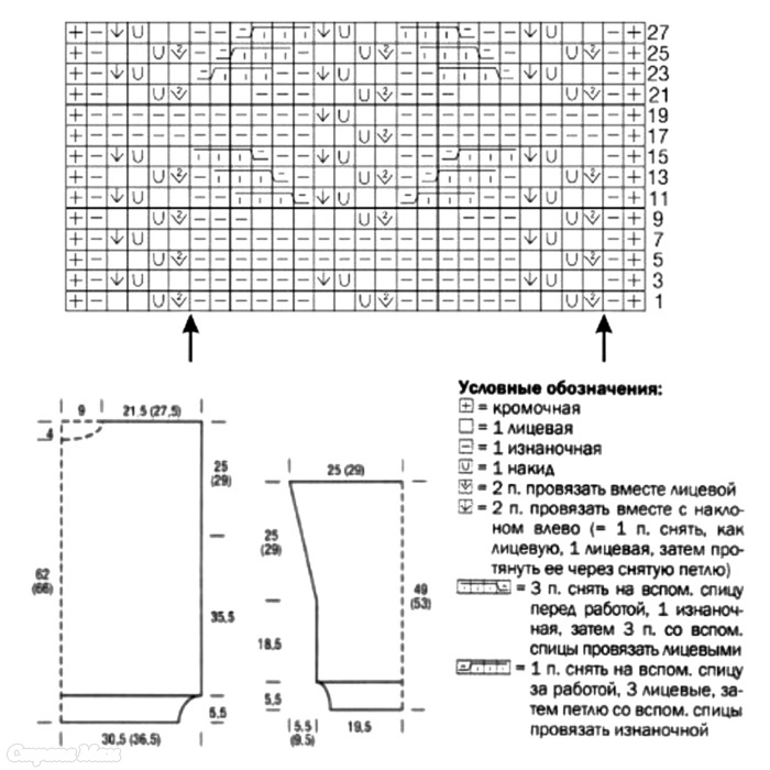 Ажурный узор. Количество петель кратно 20 + 6 п. + 2 кромочные.