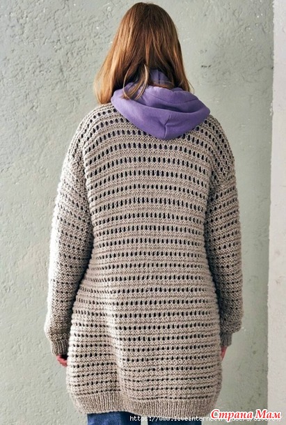 Объёмный бежево-серый кардиган оверсайз со сквозным узором. Спицы.