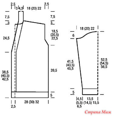 Через 58 см = 139 р. (60 см = 143 р.) 62 см = 149 р. от нижней планки закрыть с обеих сторон для плечевых скосов 1 раз по 6 (7) 9 п. и в каждом 2-м р. еще 3 раза по 7 п. (1 раз по 7 п. и 2 раза по 8 п.) 3 раза по 8 п.