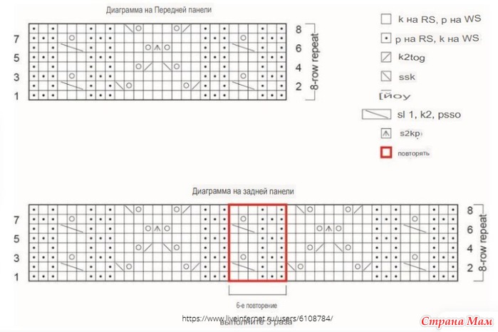6 ряд: 1 изнаночная, 1 лицевая, 1 изнаночная, 1 снятая, 2 лицевые, снятие с накидом, 1 изнаночная, 1 лицевая, 1 изнаночная, 3 лицевые, накид, снятие с накидом, накид, 3 лицевые, (1 изнаночная, 1 лицевая, 1 изнаночная, 1 снятая, 2 лицевые, снятие с накидом) 3 раза, 1 изнаночная, 1 лицевая, 1 изнаночная, 3 лицевые, накид, s2kp, yo, k3, p1, k1, p1, sl 1, k2, psso, p1, k1, p1.