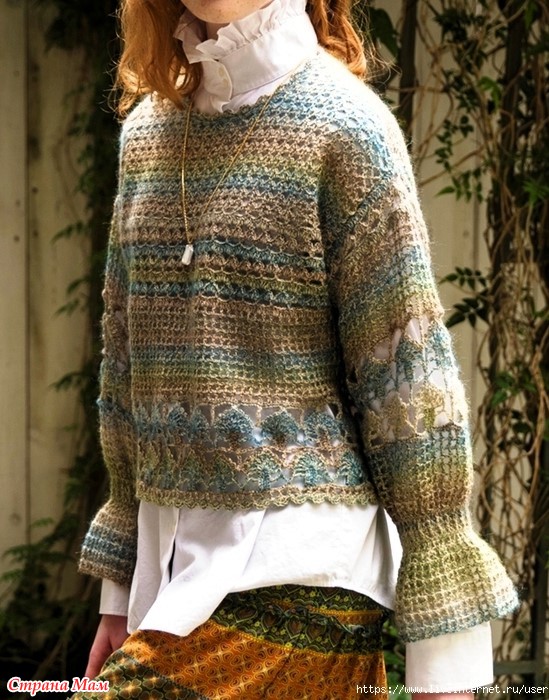 Джемпер из секционной пряжи с узорными полосками и воланами на рукавах. Крючок.