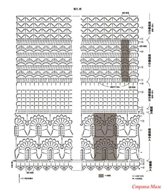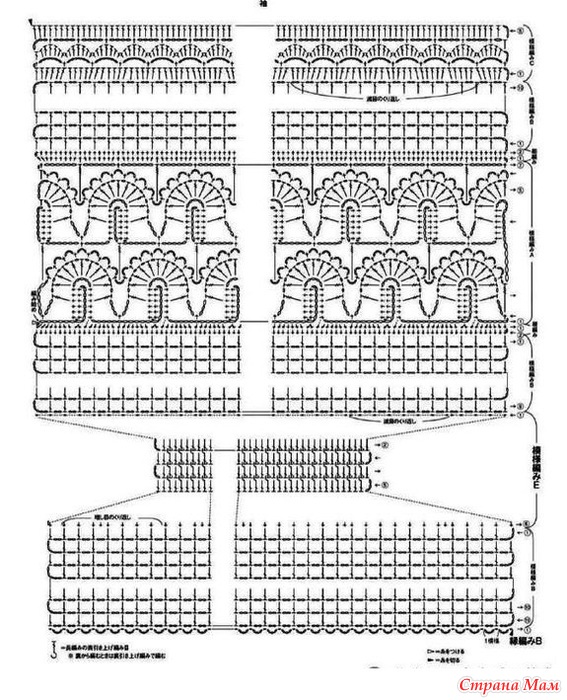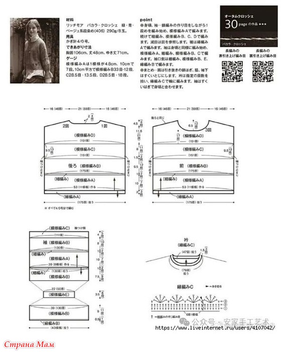 Тело, рукава... Начните первый ряд, набрав воздушную петлю, затем вяжите узорчатой ​​петлей. Продолжайте вязать, затем вяжите узорчатыми петлями B, C и D. Убавление петель смотрите на схеме. Вяжите подол каймой A. Начните вязать рукава так же, как тело, вяжите узорчатой ​​петлей A, столбиками без накида, узорчатой ​​петлей B и C. Манжеты вяжите столбиками без накида, узорчатой ​​петлей B и каймой E.