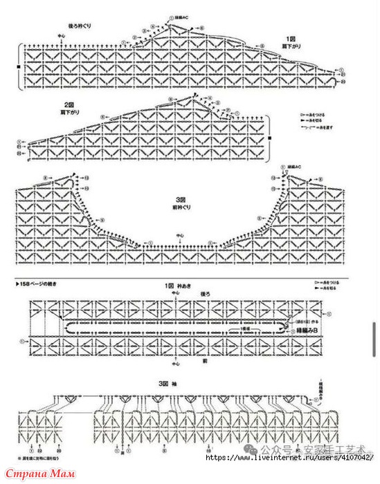 Краткое описание: Плечи выполнены вытяжным швом, боковые стороны и подмышки выполнены совместным швом. Наберите указанное количество петель и вяжите по кругу кромочным швом C. Рукава соединены с корпусом совместным швом.