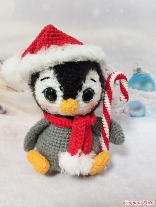 Я сначала связала одежду, потом решила, что этого мало, и связала конфету. А потом дочка выпросила маленького снеговичка. И затребовала сфотографировать с пингвиненком. Так и получился у помощника свой помощник
