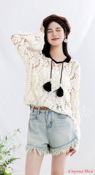 Этот пуловер состоит из корпуса, переда и спинки, рукавов, швов, воротника и отделки. Сначала вяжется корпус, затем отдельно спинка и перед, затем рукава. После этого выполняется сшивание, вяжется воротник, и, наконец, выполняется и устанавливается отделка.