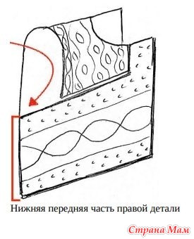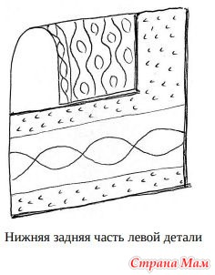 Эти детали вяжутся путем поднятия петель вдоль нижней части левой передней детали и нижней части правой задней детали. Первые 3 см детали помещаются под рукав и становятся частью края проймы.