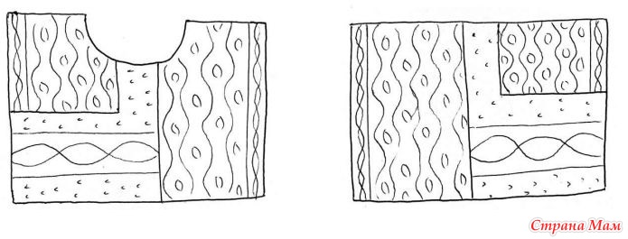 Эти детали вяжутся путем поднятия петель вдоль нижней части левой передней детали и нижней части правой задней детали. Первые 3 см детали помещаются под рукав и становятся частью края проймы.