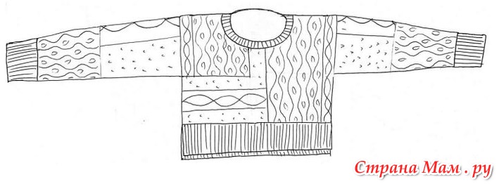 Вяжется длинный прямоугольник, снизу вверх. Вы начинаете со спинки и на уровне плеча начнёте формирование выреза горловины.