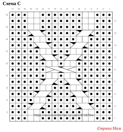 Вязать схемы и изн. п. с кром.п. с обеих сторон пока размер работы не станет 24 (28) 32 см.