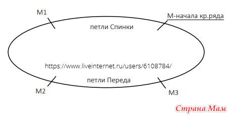 След.кр.ряд-разделение: лиц-до М-спинки, ПМ, узор Рис-до М-спинки, ПМ, лиц-до M1, удалить M, и след. 50 (50, 52, 54)( 54, 56, 58)(64, 68, 68)п - перевести на держатель, удалить M2, набрать 3 (4, 5, 5)(6, 7, 8)(9, 11, 13)п, ПМ-начала кр.ряда (это ваш новый М), набрать 3 (4, 5, 5)(6, 7, 8)(9, 11, 13)п, лиц-до М-переда, ПМ, вязать Панель-до М-переда, ПМ, лиц-до M3, удалить M, и след.50 (50, 52, 54)( 54, 56, 58)(64, 68, 68)п - перевести на держатель, удалить старый М-начала кр.ряда, набрать 3 (4, 5, 5)(6, 7, 8)(9, 11, 13)п, ПМ-бокового шва, набрать еще 3 (4, 5, 5)(6, 7, 8)(9, 11, 13)п, лиц-до М-спинки, ПМ, узор Рис-до М-спинки, ПМ, все лиц-до вашего нового М-начала кр.ряда.
