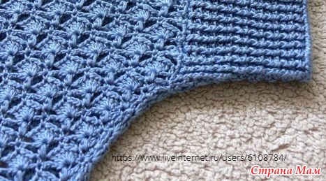 высотой 2 см по низу спинки и переда с изнаночной стороны крючком №1.75 необходимо провязать 1 ряд ст.б/н., так чтобы на 1 раппорт из 8 петель основного узора приходилось 7 ст. б/н. Это установочный ряд «резинки».