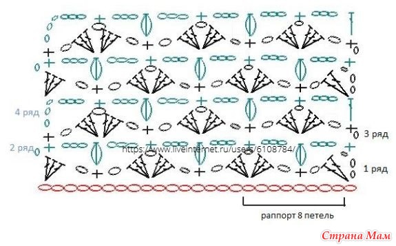 Основной узор (см. схема 1): на схеме показаны прямые и обратные ряды, количество воздушных петель (в.п.) набора кратно 8 + 1п. (для симметрии) + 3в.п. для подъема. Раппорт: 8 п.*4р.