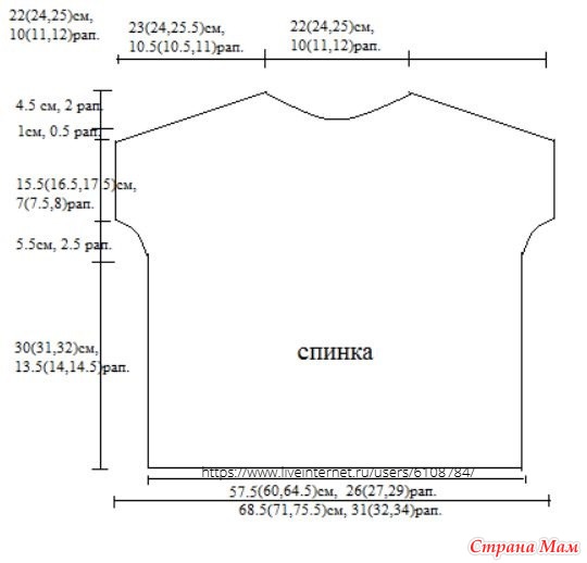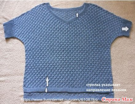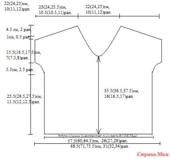 Примечание. Изделие выполняется отдельными деталями снизу вверх, перед пуловера короче спинки на 4.5 см. После того как будут связаны полочки, их необходимо увлажнить и оставить до полного высыхания. Только после этого сшить по швам и довязать планки горловины, рукавов и полочек внизу.
