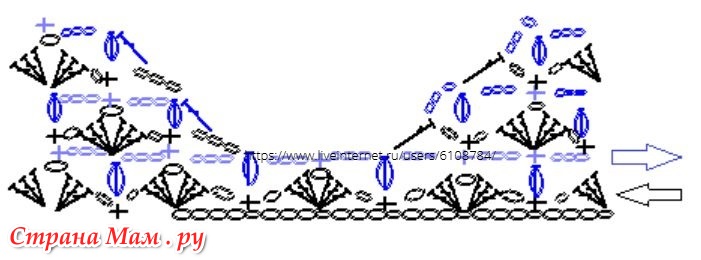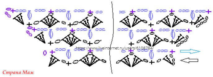 Основной узор (см. схема 1): на схеме показаны прямые и обратные ряды, количество воздушных петель (в.п.) набора кратно 8 + 1п. (для симметрии) + 3в.п. для подъема. Раппорт: 8 п.*4р.