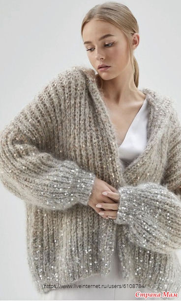 На протяжении всего вязания к основной нити добавляем нить пайеток, причем можно низ изделия связать с пайетками цвет золото, к верху изделия выполнить переход к пайеткам цвет серебро. Интенсивность ввязывания пайеток тоже можно менять: по низу изделия и рукавов пайетки ввязывать интенсивнее (в каждый ряд), к верху изделия пайетки постепенно можно ввязывать реже, через 2, 4, 6… рядов.