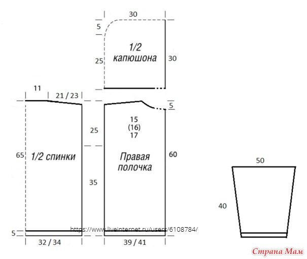 Нижний край капюшона вшить в горловину (71 петля). Этот шов необходим для того, чтобы полотно не растягивалось.