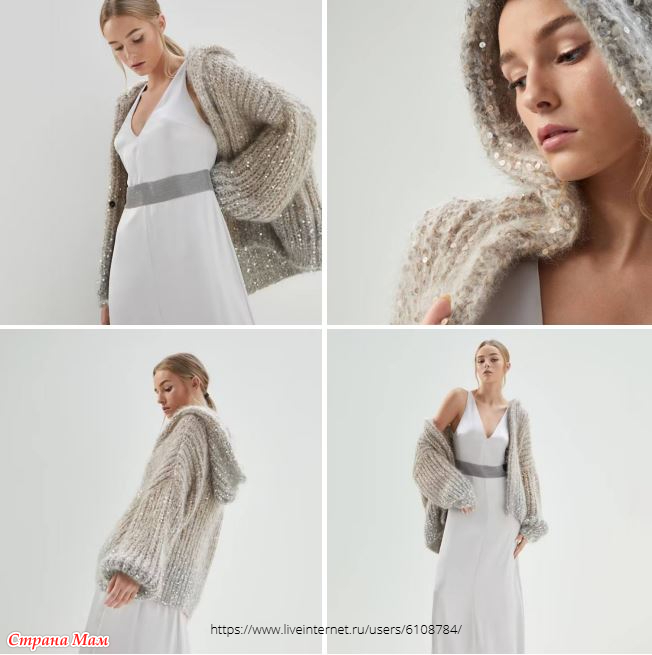 На протяжении всего вязания к основной нити добавляем нить пайеток, причем можно низ изделия связать с пайетками цвет золото, к верху изделия выполнить переход к пайеткам цвет серебро. Интенсивность ввязывания пайеток тоже можно менять: по низу изделия и рукавов пайетки ввязывать интенсивнее (в каждый ряд), к верху изделия пайетки постепенно можно ввязывать реже, через 2, 4, 6… рядов.