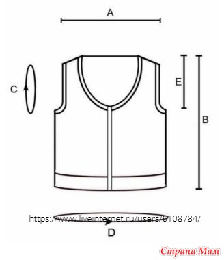 Е- глубина горловины переда 20 (21.5, 21.5, 23, 23, 24.5)см.