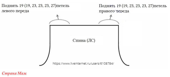 Нитью А и спицами 3.25мм, с лицевой стороны, начиная от центра подмышки, поднять и провязать лицевыми 7 (7, 7, 9, 9, 9)петель по наборному краю подмышки, затем поднять и провязать лицевыми 107 (119, 119, 131, 131, 143)петли (3петли на каждые 4ряда) по краю проймы, поднять и провязать лицевыми 6 (6, 6, 8, 8, 8)петель по оставшейся части наборного края подмышки, поместить маркер начала ряда= 120 (132, 132, 148, 148, 150)петель.