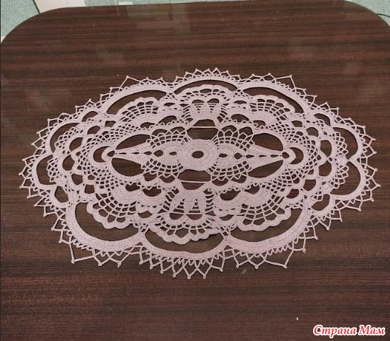 Давно засматривалась на эту салфетку. Схему нашла в инете и хорошо что она цветная, где показаны цветом ряды, иначе запуталась бы. В инете есть и черно-белая схема, но не советую. Нитки Ярнарт виолет, 282м/50 гр, крючок №1. Размер получился 59х40см. Крючок взяла поменьше, так как мне была нужна салфетка небольшого размера, но она получилась все равно достаточно большой.