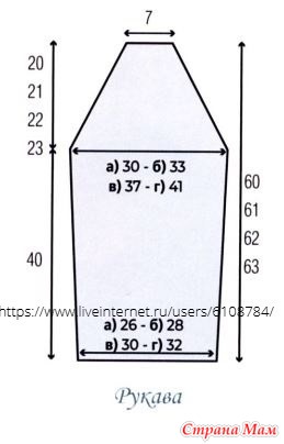 Стало: а) 69 п. – б) 75 п. – в) 83 п. - г) 93 п. ,p>Через 40 см от наборного р. для формирования реглана выпол ните с каждой стороны на расстоянии 1 п. от краев а) б) в) 1 простое убавление – г) 1 двойное убавление, затем а) * через 4 р.: 1 простое убавление и в каждом 2-м р.: 4 раза по 1 простому убавлению *; повт. от * до * всего 5 раз – б) * через 4 р.: 1 простое убавление и в каждом 2-м р.: 8 раз по 1 простому убавлению *; повт. от * до * всего 3 раза и закончите 1 простым убавлением - в) через 4 р.: 1 простое убавление и в каждом 2-м р.: 31 раз по 1 простому убавлению - г) в каждом 2-м р.: * 11 раз по 1 простому убавлению, 1 двойное убавление *; повт. от * до * всего 2 раза и закончите 10 простыми убавлениями.