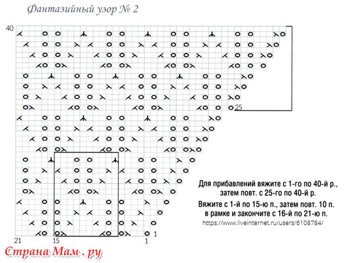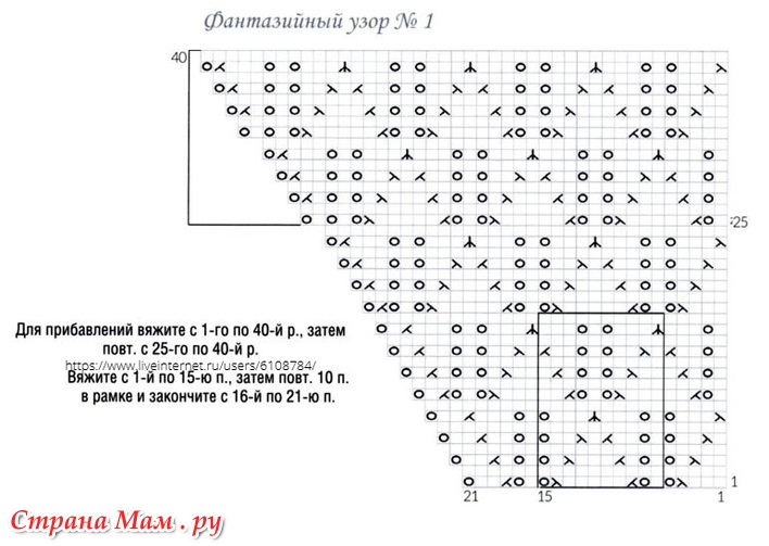 Для формирования реглана отметьте центральную п. цветной нитью или колечком-маркером и делайте прибавления с обеих сторон от отмеченной п. след. образом, соблюдая сх. узора: в каждом 2-м р.: