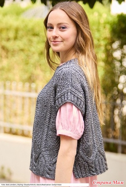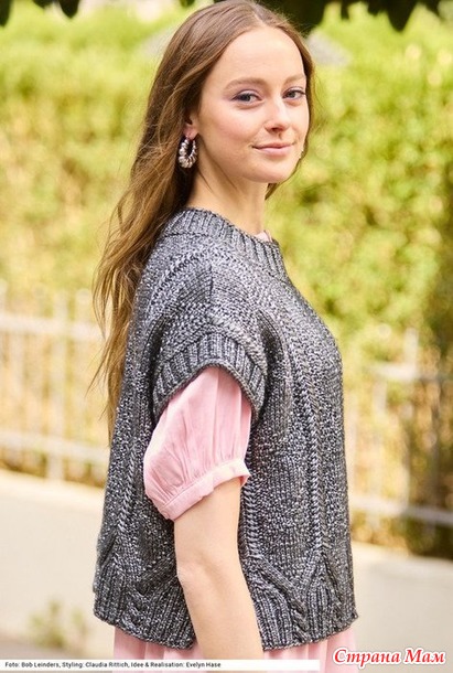 Короткие просторные жилеты снова в тренде, и эта вязаная модель не исключение. Ее можно стилизовать любым способом, но в то же время чудесный рельефный узор из «кос» и слегка блестящая пряжа добавят в образ изысканную нотку.